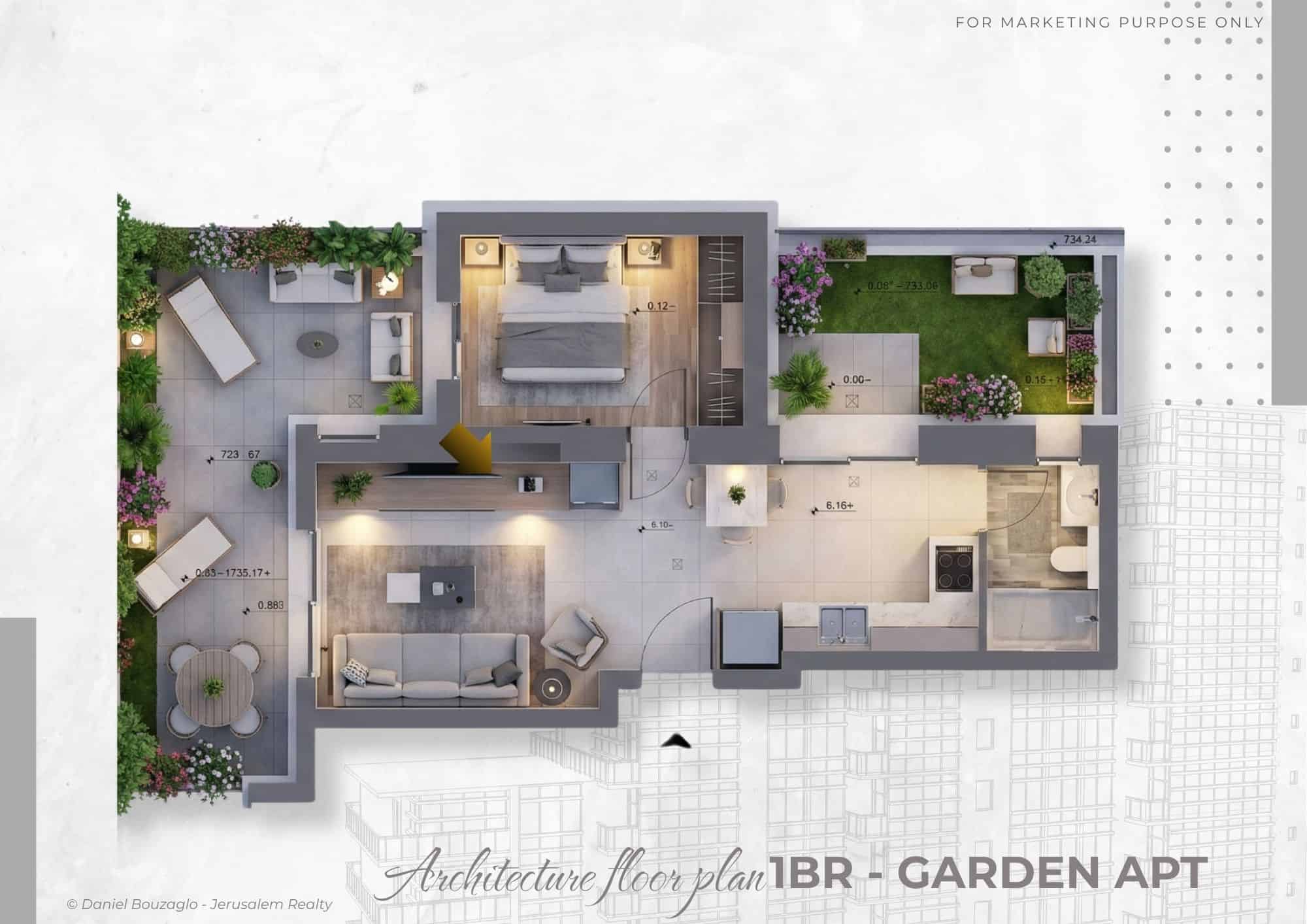 אנו מציעים בבלעדיות את הזכות לרכוש דירת גן חדשה עם חדר שינה וסלון